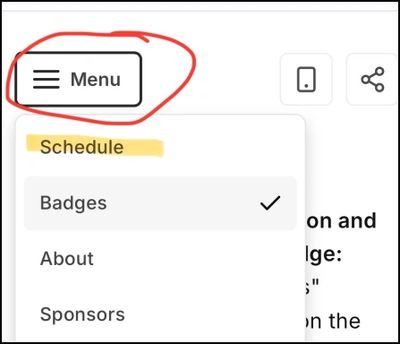 Find the Schedule: If you're on the Sched website in the Browser and see only Badges, tap the MENU button and you will see the Schedule of events. (see image on the right)